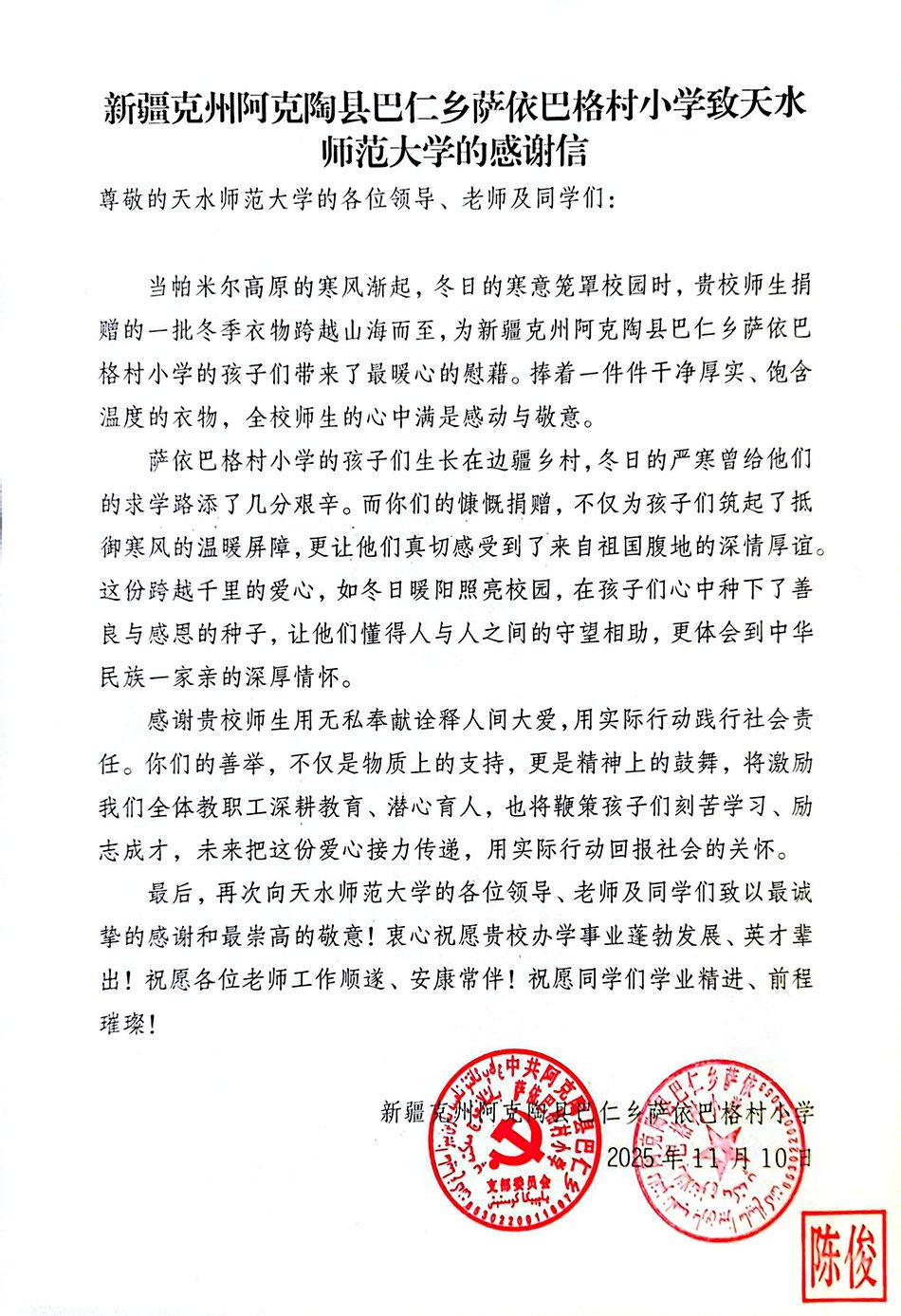 近日,一封承载着浓浓谢意的信件,从新疆克州阿克陶县巴仁乡萨依巴格村小学寄达我校。信中,该小学师生对资源与环境工程学院师生发起的“衣暖童心”冬季捐赠活动表达了诚挚谢意。这场跨越千里的温暖传递,不仅为边疆地区的孩子们送去了抵御严寒的物资,更成为我校学子胸怀“国之大者”、积极服务西部基层的生动写照。